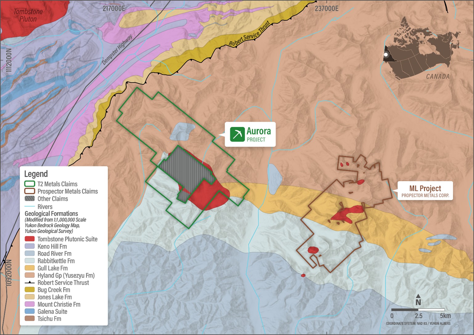 Aurora is strategically located between the Tintina Fault to the south and the Dawson Thrust Fault to the north, with the Robert Service Thrust situated on the western edge of the property. This regional-scale fault network has provided access for hydrothermal fluids associated with the younger Tombstone-age intrusions.